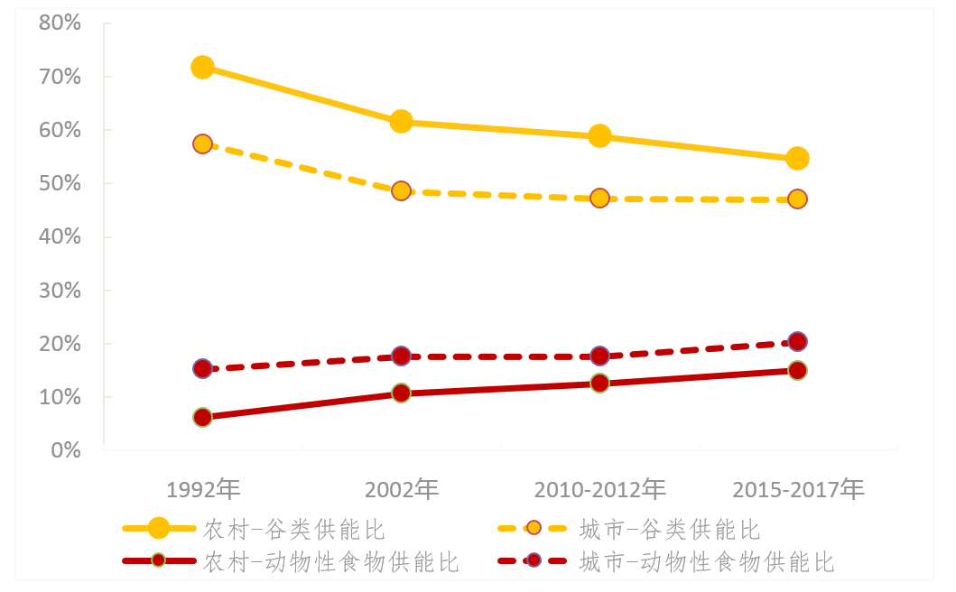 中国城乡居民的膳食结构还存在着较大差异,城市居民的谷类食物供能比低于农村居民,而动物性食物供能比高于农村居民,但二者的变迁趋势相似,见图1。