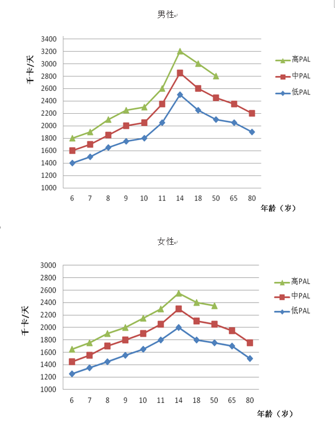图1中国6岁以上人群不同身体活动水平(PAL)下能量需要量