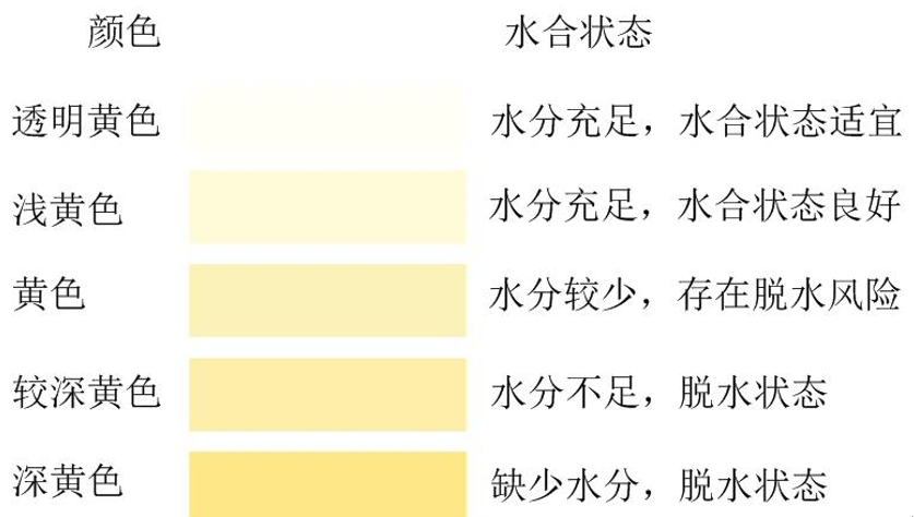 (2)排尿次数和排尿量:当机体排尿次数和尿液量比平时减少时,提示水分摄入过少,机体可能出现缺水状态。